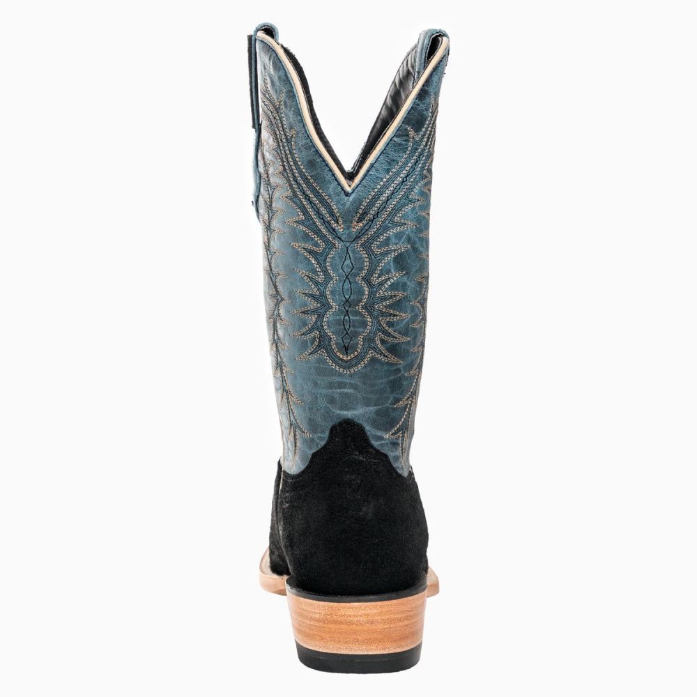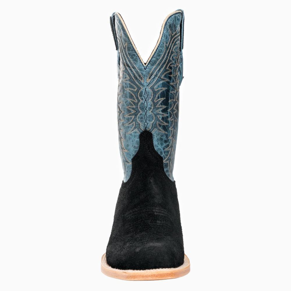 With no-nonsense black roughout and a denim blue shaft, this boot is made to handle business. Put them to the test and they'll pass with flying colors. It is as good on the town as it is in the saddle. Available in the cutter toe and western heel.
