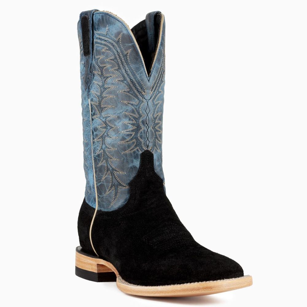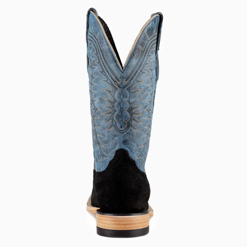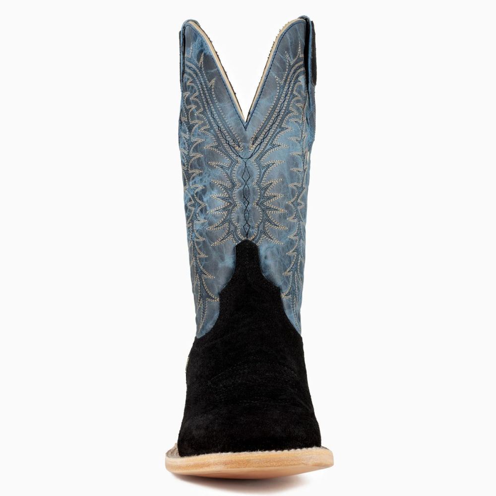 With no-nonsense black roughout and a denim blue shaft, this boot is made to handle business. Put them to the test and they'll pass with flying colors. It is as good on the town as it is in the saddle. Available in the cowboy square toe and stockman heel.