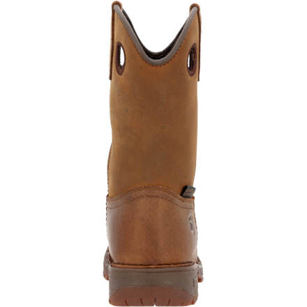 The Rocky Big Kid's Legacy 32 Pull-On Western Boot delivers great western style at a great value. This medium brown 8-inch boot is made with waterproof full-grain leather. Built to keep up with your little one's adventures, this square toe boot features a stitch out construction, fiberglass shank, and an oil- and slip-resisting rubber outsole. Puddles are no match for this boot with all around waterproofing by Rocky, guaranteed to keep feet dry when they need it most. The expansion fit seam and convenient pull holes makes it an easy on and off, while its cushioned footbed keeps feet comfortable all day long.