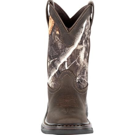 The Rocky Kids' Ride FLX eight-inch brown and Realtree Camouflage wellington featuring Rocky Waterproof is a great durable western boot for kids that like to go outside and play. Convenient pull straps and resilient material allows any kid to pull their boots on and go. Constructed with a light and flexible construction and padded cushioned insoles, these boots will be so comfortable, your child will never want to take them off! If you're looking for a reliable boot that will allow your kid to play in comfort all day long, this boot is exactly what you need!