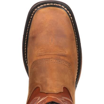 These 11-inch men's western work boots have full-grain leather uppers. The foot is tan paired with an ochre shaft that features stitching detail. The boot has both pull straps and pull loops, as well as a great western square toe.