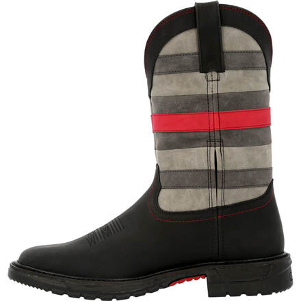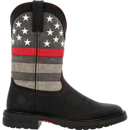 Want to show your support and give back to those in Public Service The Rocky Red Line Men's Western Boot was designed with the idea of comfort and giving back in mind. The eight-layer comfort system was created so each element and layer offers additional comfort, from the orthotic element to the outsole. When you wear these comfortable western boots, you can work, walk or stand all day.