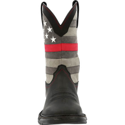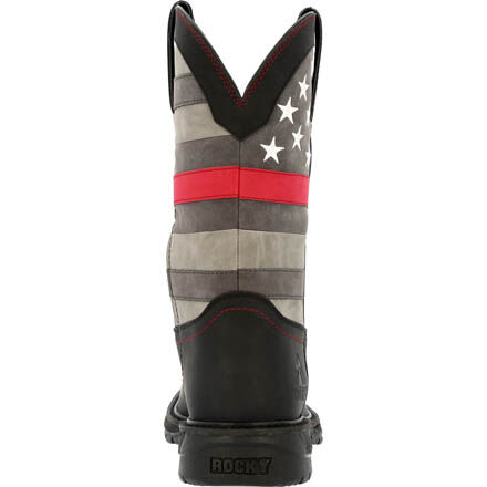 Want to show your support and give back to those in Public Service The Rocky Red Line Men's Western Boot was designed with the idea of comfort and giving back in mind. The eight-layer comfort system was created so each element and layer offers additional comfort, from the orthotic element to the outsole. When you wear these comfortable western boots, you can work, walk or stand all day.