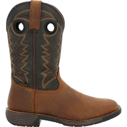 The Rocky Rugged Trail Waterproof Steel western boot is built to tackle any true western terrain. Crafted with a black and brown upper and rich waterproof full-grain leather, this boot is not only durable but equipped to get the job done. Light and flexible cement construction makes this boot practical and comfortable.
