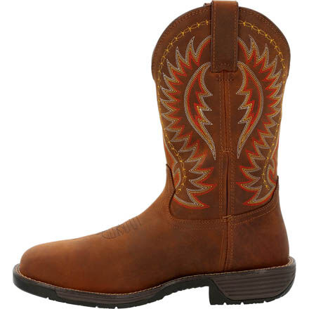 Oil and slip resisting rubber outsole keep you on your feet and the fiberglass shank provides stability. Pull tabs and holes give plenty of options for helping to slip this boot on easily. The steel square toe keeps you safe. If you're looking for a western boot that can be worn just about anywhere, get the Rocky Rugged Trail Waterproof Steel Toe 11" western boot.