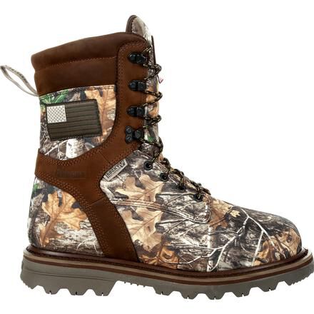 Made in USA with USA and globally sourced components. The Rocky Stalker is built to take on the great outdoors. This 9-inch Realtree Edge insulated waterproof boot will help you make the most of any hunt. Tackle any terrain with 900 denier Cordura, leather accents, a light and flexible cement construction, and a durable heavy duty self-cleaning polyurethane outsole. Experience unrivaled comfort with Rocky