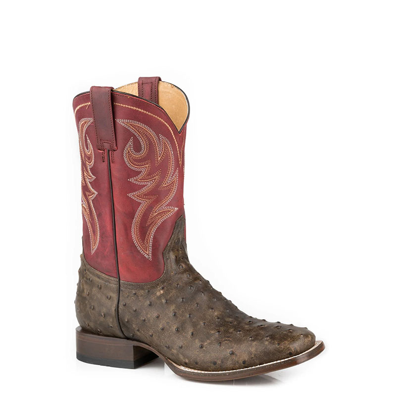 - ROPER | MEN'S VINTAGE BROWN EMBOSSED OSTRICH VAMP SQUARE TOE BOOT WITH OILD RED SHAFT-TAN | STYLISH OUTLET