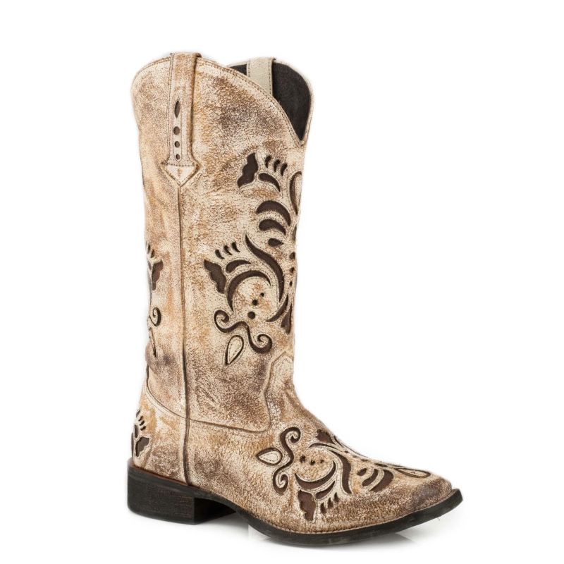 - ROPER | WOMEN'S COWBOY BOOT VINTAGE BEIGE FAUX LEATHER WITH METALLIC GOLD UNDERLAY-TAN | STYLISH OUTLET