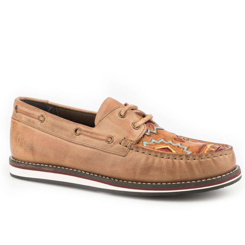 - ROPER | WOMEN'S SLIP ON MOCCASIN TAN BURNISHED LEATHER WITH HANDTOOLED CACTUS VAMP-TAN | STYLISH OUTLET