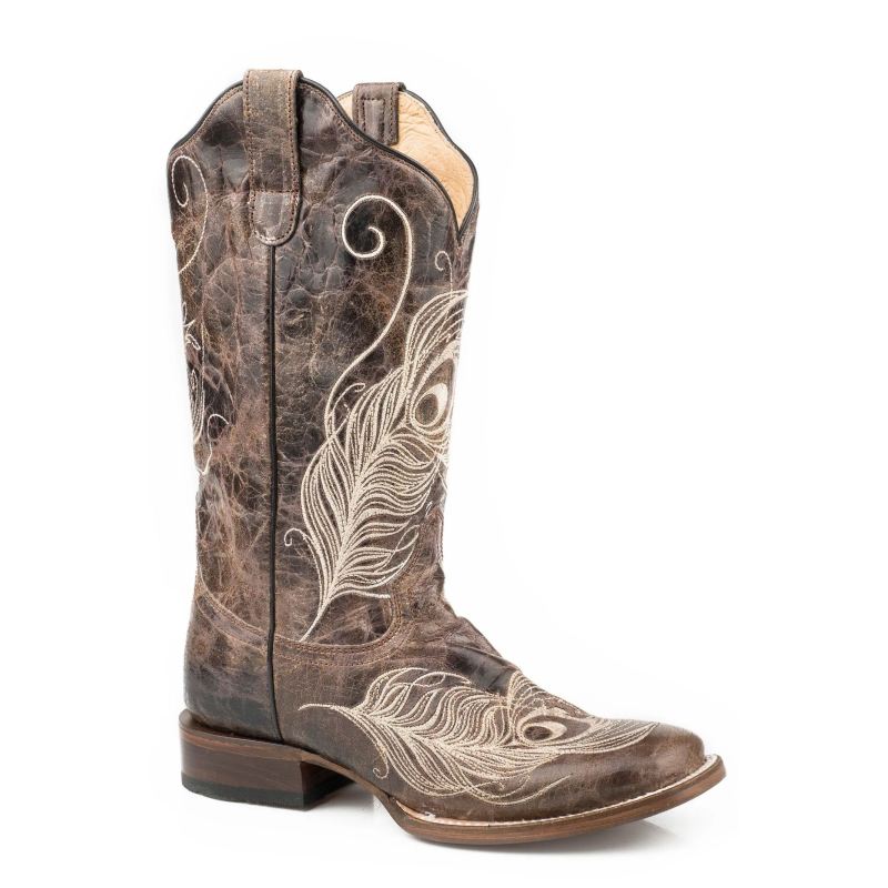 - ROPER | WOMEN'S LEATHER COWBOY BOOT DISTRESSED BROWN WITH WITH ALL OVER EMBROIDERY-BROWN | STYLISH OUTLET