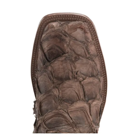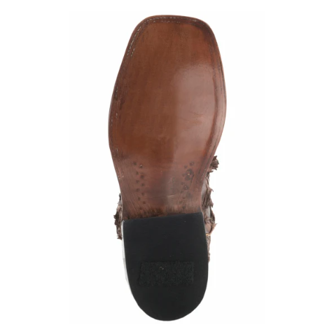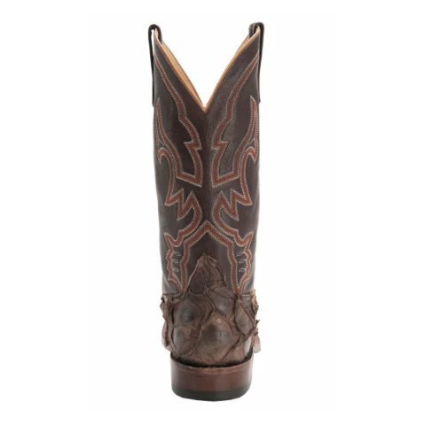The components and bootmaking practices of Anderson Bean is what makes their boots exceptional. Anderson Bean men's chocolate brown boot with a distressed brown big bass fish foot. 13" height, wide square toe, with pull straps.