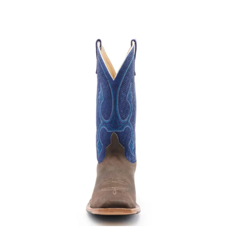 Anderson Bean presents these Natural Boar western square toe boots. These boots have a tan foot and a blue chex upper. They have a square toe, side seam and piping, steel shank for maximum support, premium cowhide lining, a double lasted vamp, leather outsole and a block heel. 13" total in height. Handmade in Texas.