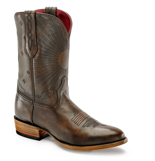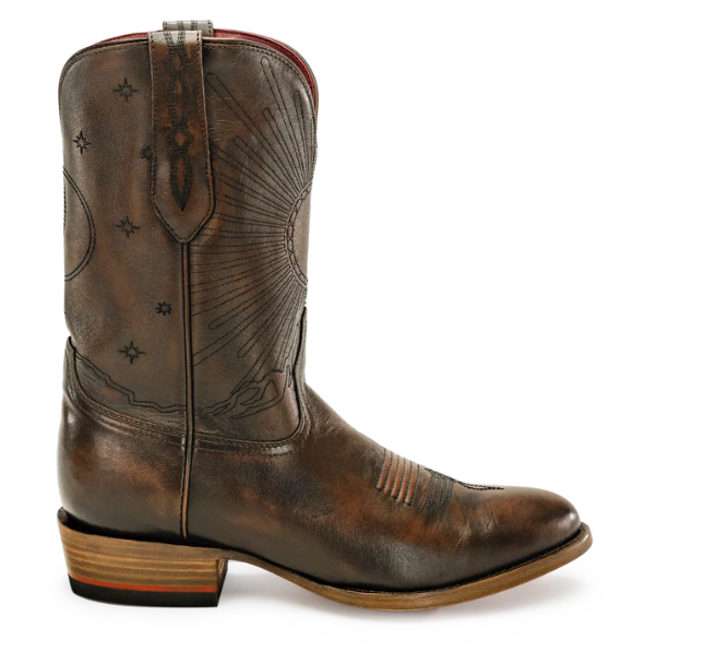The No. 1 is crafted from Chisos heritage cowhide, available in either our speckled magic black, gorgeous brushed brown, or roughout. The artwork shows the sun and stars over the Chisos Mountains in Big Bend National Park and our signature red heel stripe completes the piece.
