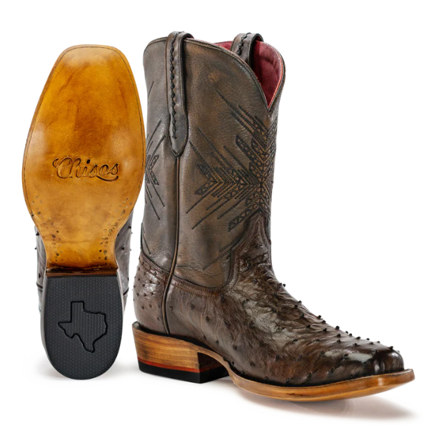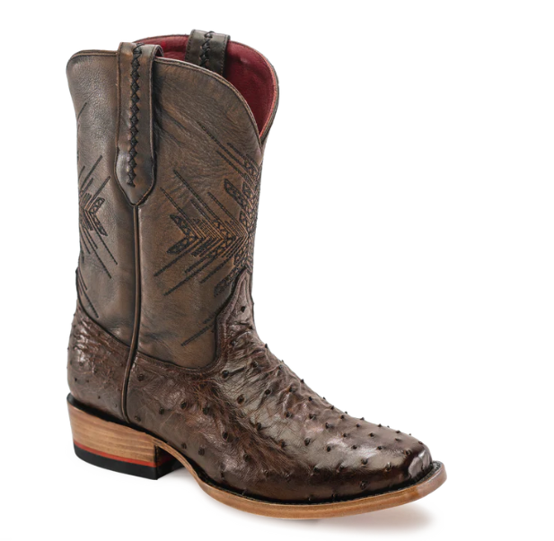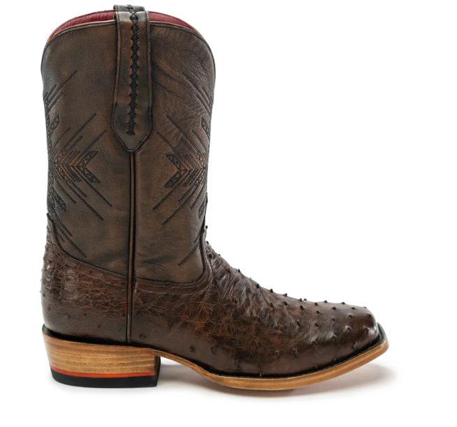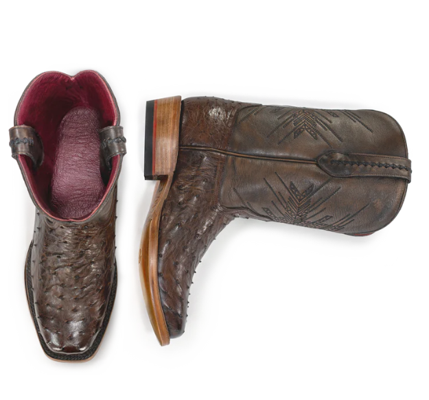 Full full-quill ostrich vamps perfectly tanned to match our signature brush-off brown cowhide shafts. An understated statement, the No. 2 moves easily between the ranch and downtown. Featuring geometric embroidery inspired by the petroglyphs in Big Bend National Park.
