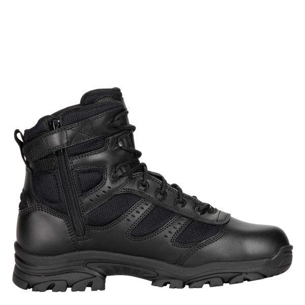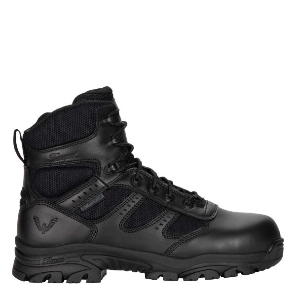 Where does the job take you Wherever the action is. Be prepared to move with confidence in any direction, on any surface, with the rugged lug, dual density Z-Trac outsole in these black leather and performance air mesh nylon side zip boots. The BBP Waterproof membrane protects you from dangerous fluids, too. A composite safety toe protects from impact. Composite shank gives your arches extra reinforcement. And a removable polyurethane SHOCK ZONE insole means you can save the day without harming your feet.