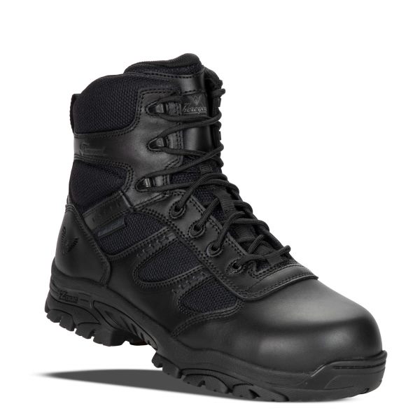 Where does the job take you Wherever the action is. Be prepared to move with confidence in any direction, on any surface, with the rugged lug, dual density Z-Trac outsole in these black leather and performance air mesh nylon side zip boots. The BBP Waterproof barrier protects you from dangerous fluids, too. Composite shank gives your arches extra reinforcement. And a removable polyurethane SHOCK ZONE insole means you can save the day without harming your feet.