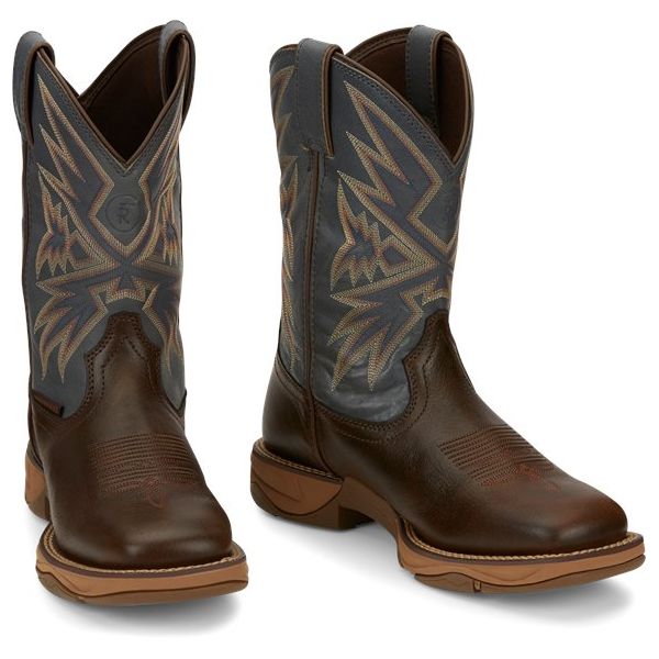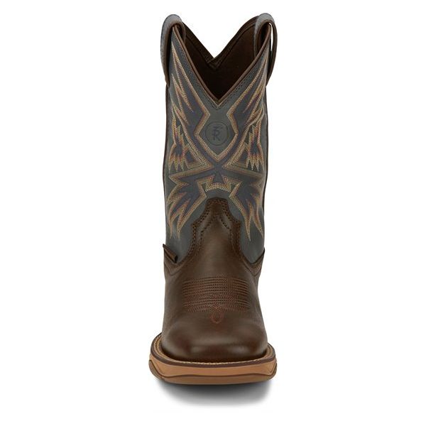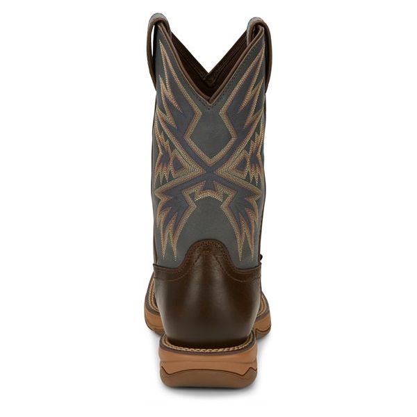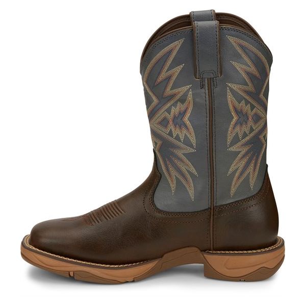 It's crafted with a deep brown buffalo leather foot that's teamed up with a grey cowhide leather upper with dynamic stitching. This 11" tall wide square toe features a rubber outsole for durability and traction and it's equipped for comfort with an orthotic insole inside.