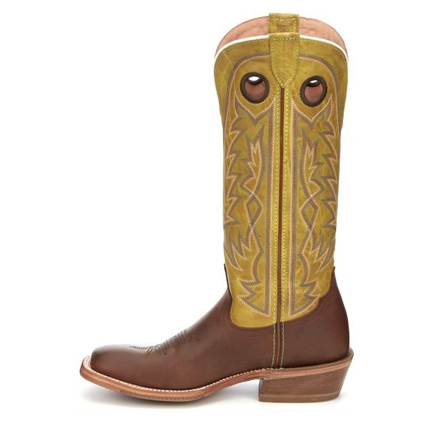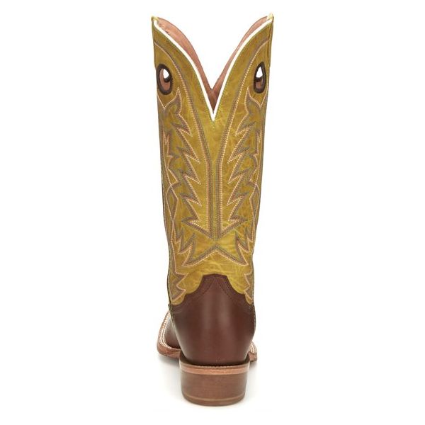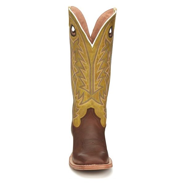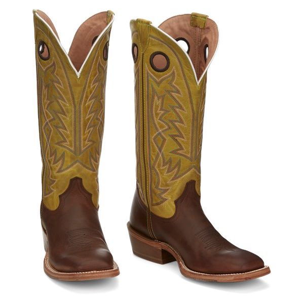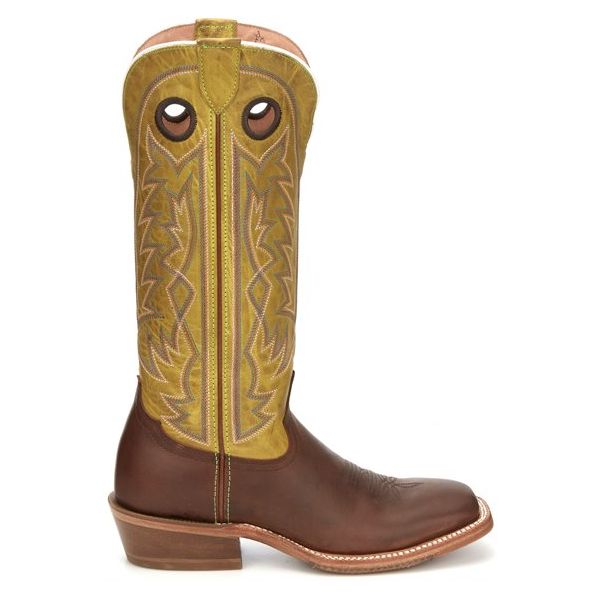 This 15" tall wide-square toe silhouette brings a moss green embroidered leather upper together with a brown leather foot and features our Cushion Comfort insole for the support you need underfoot. The streamlined western heel with spur ledge ensures a comfortable ride.