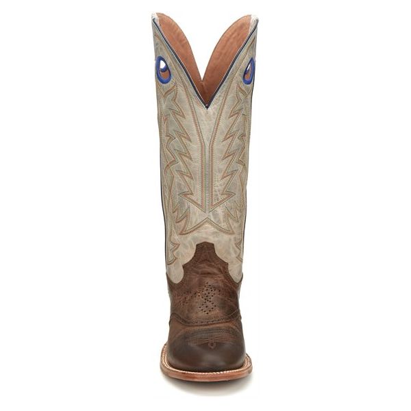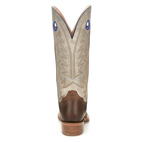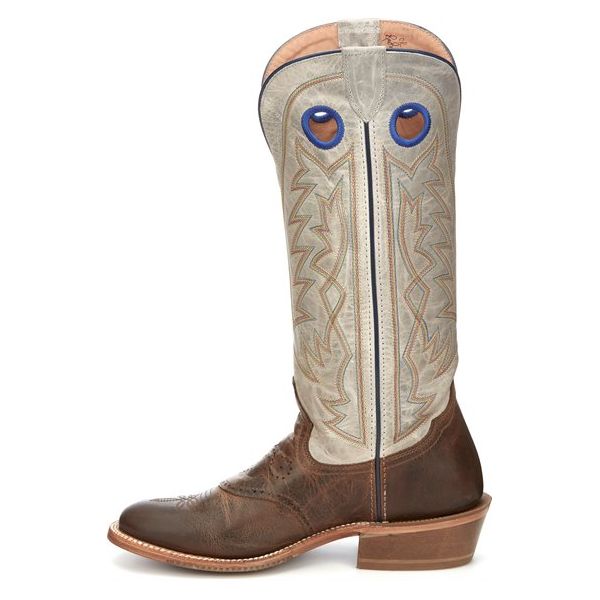 The Henley Buckaroo in Stout Brown features a distressed foot with toe bug and broguing details for iconic western style. Its 15" tall profile is topped with a grey leather upper that's hand-distressed, giving it the well-worn character of a boot that's seen a few rides. The western heel with spur ledge and wide round toe complete its distinctive profile. Inside, the Cushion Comfort insole delivers all-day comfort.