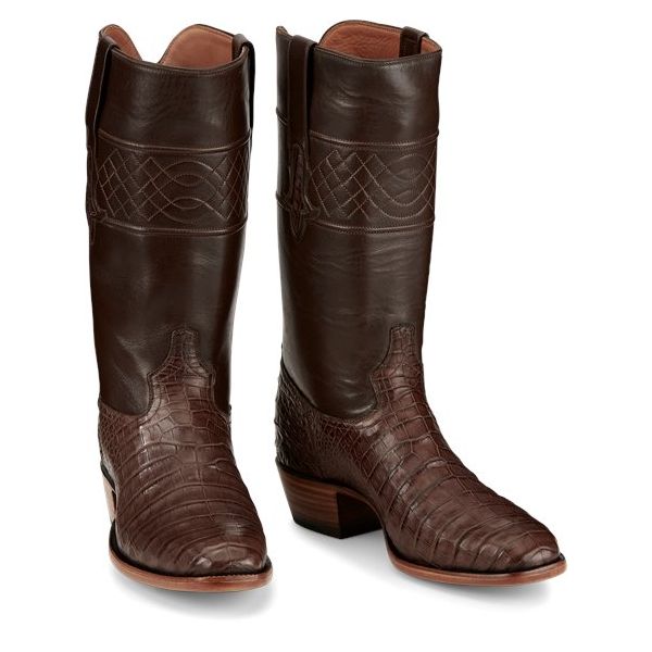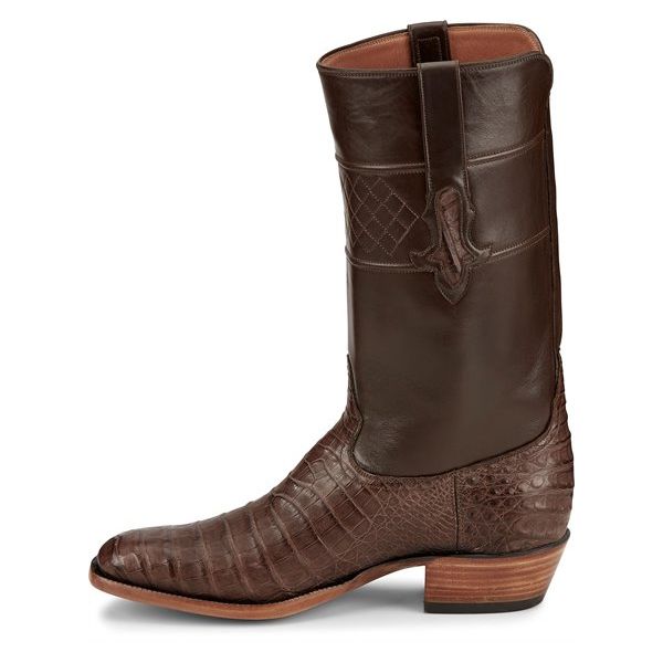 The 12" Kapono boot from the Signature Series features an exotic Belly Caiman foot and a smooth leather shaft accented with a refined diamond-stitch band. This statement boot is finished with a leather outsole and a 1 3/8" long base heel. This style is proudly Made in the USA from global parts.