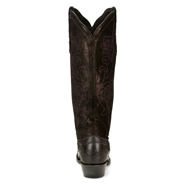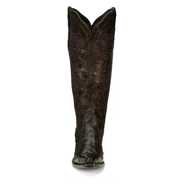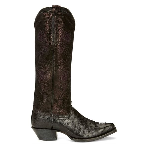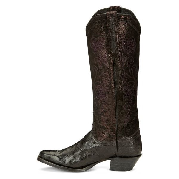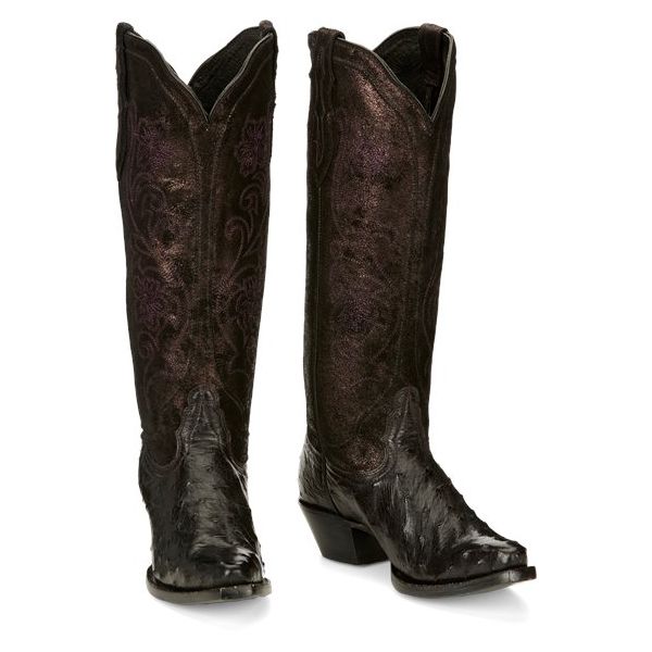 This dramatic 15" boot from our Vaqueras collection is a striking silhouette in deep, black plum tones. The hand-distressed metallic suede upper showcases exquisite embroidery that complements the distinctive shadow finish on the full quill ostrich vamp. This innovative antique effect is designed to highlight the appearance of each individual quill for a vivid, unforgettable look. Our Lama Comfort system brings comfort to your every step, and the fashionable narrow square toe perfects this gorgeous boot.