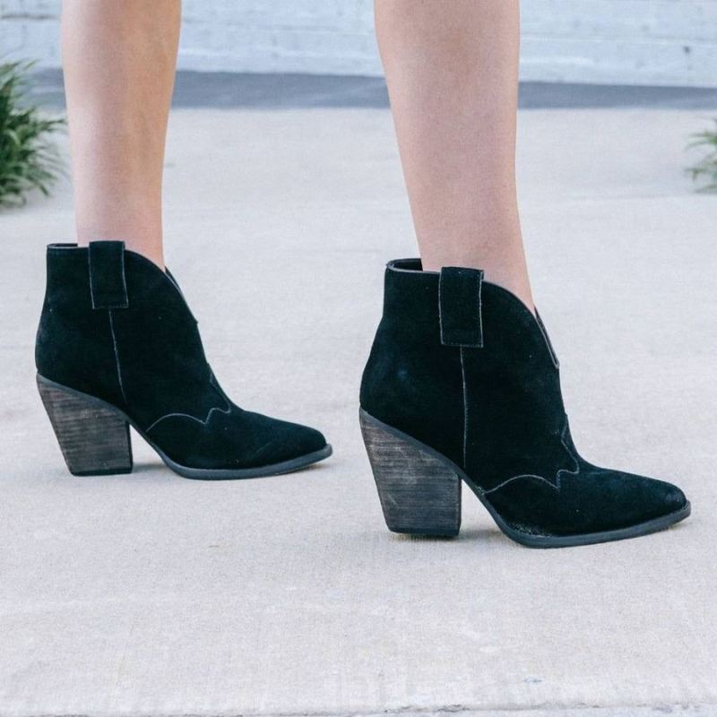 Short boots are here to stay. The #Flannie is made of a soft suede with a deep western dip along the top line. The high fashion heel amps up the style quotient. Fashion snip toe and cushion insole. #Flannie