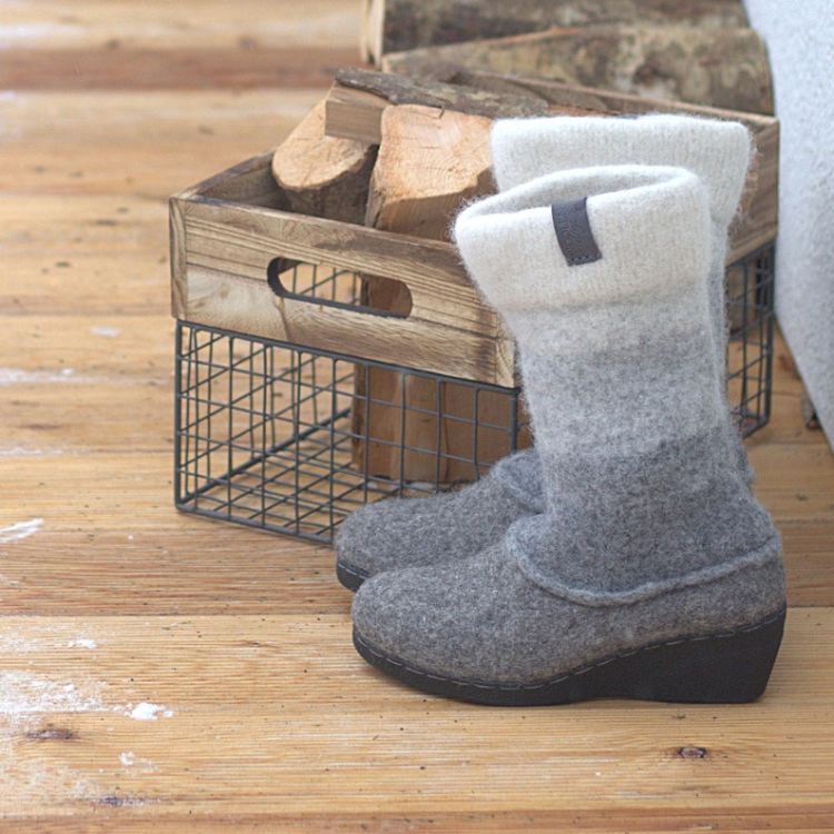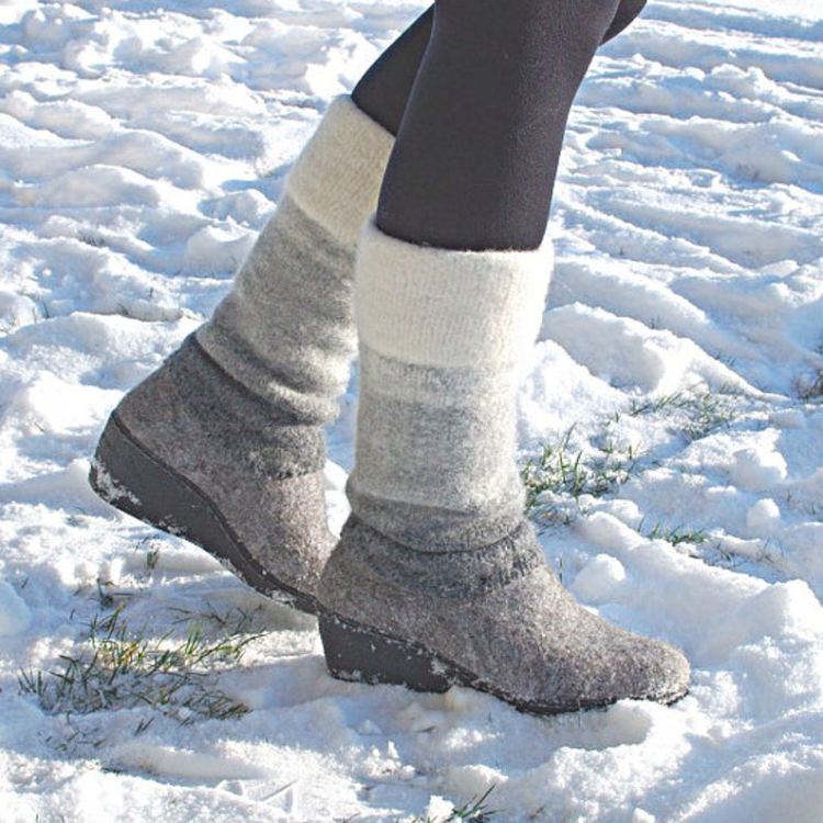 Warm, durable, natural footwear for Winter. Natural gray and white shades of wool make these two tone boots very unique and will turn heads when you walk.