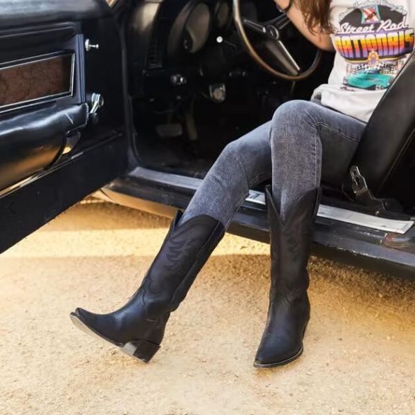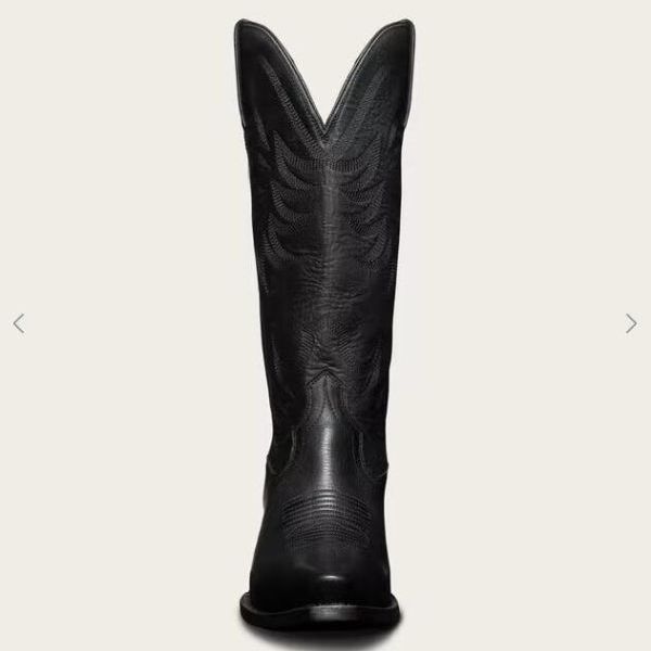 Our newest cowgirl boot features a tall, angled heel and 14" shaft adorned with a beautiful stitched pattern in gradient tonal thread. The shaft features a deep scallop for a comfortable, flattering fit and the new snip toe is complemented by classic toe bug stitching. These premium boots are not to be missed and will age beautifully over time. Available in bovine and suede.