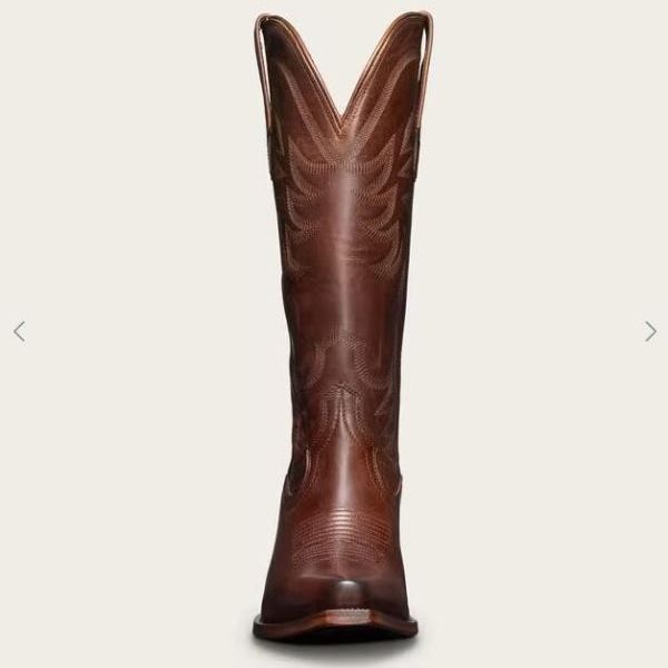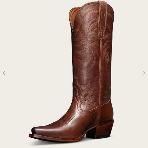 Our newest cowgirl boot features a tall, angled heel and 14" shaft adorned with a beautiful stitched pattern in gradient tonal thread. The shaft features a deep scallop for a comfortable, flattering fit and the new snip toe is complemented by classic toe bug stitching. These premium boots are not to be missed and will age beautifully over time. Available in bovine and suede.