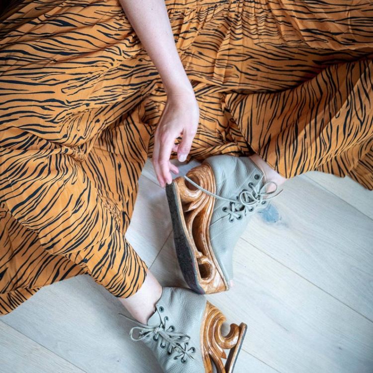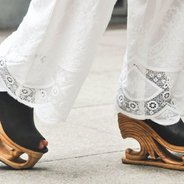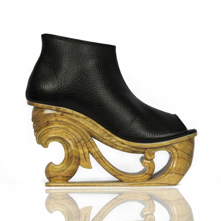 Custom painting of the wooden wedge heel is available by lacquer artisans